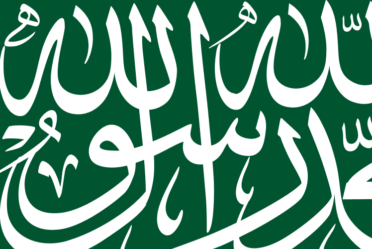 تتوسطه الشهادتان "لا إله إلا الله محمد رسول الله" باللون الأبيض وسيف مسلول تحتهما وموازٍ لهما تتجه قبضته إلى القسم الأدنى من العلم