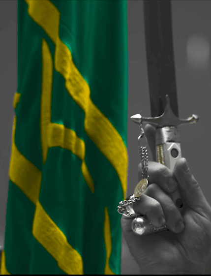 يكون باللون الأخضر ويطرز رسم الشهادة والسيف بخيوط ذهبية